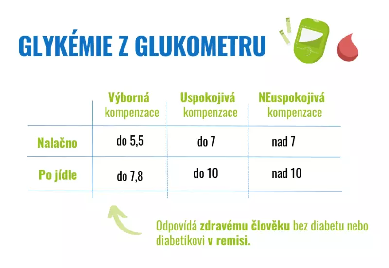 Pro přehlednost jsou hodnoty ideální glykémie u jedinců s cukrovkou uvedeny v tabulce. Za výbornou kompenzaci cukrovky jsou považovány hodnoty glykémie nalačno do 6,0 mmol/l a glykémie dvě hodiny po jídle do 7,5 mmol/l. U seniorů a dětí jsou pak tolerovány glykémie i o něco vyšší.
