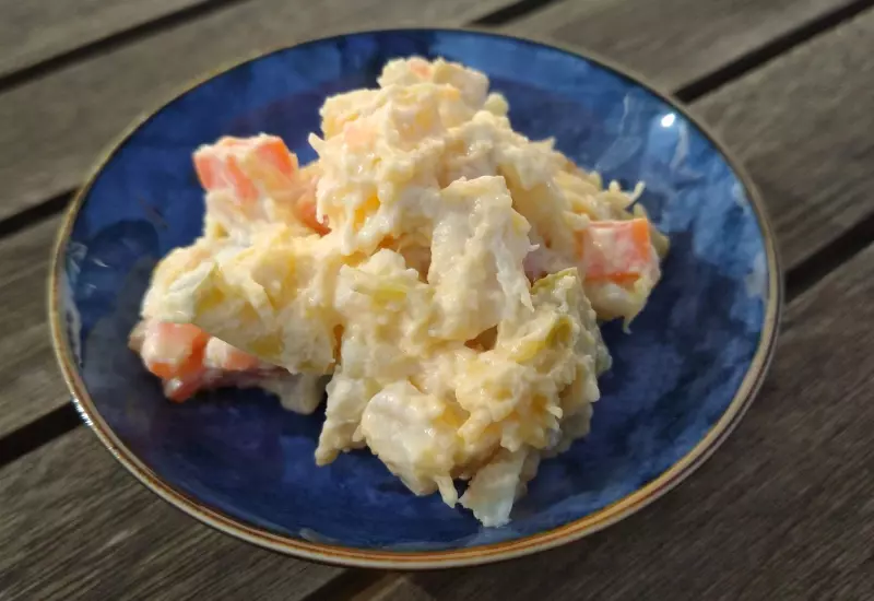 Kostičky drží dobře tvar, konzistence je křupavá a hutná. Jsou mírně nasládlé, ale méně než petržel. Jinak je chuť neutální a nepřebíjí ani neruší ostatní chutě. Salát jako takový je elmi dobrý, ale za náhradu brambor do klasického bramborového salátu bychom je nevolily.