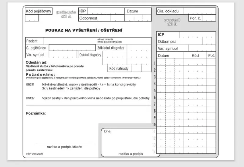 K vystavení žádanky lékař potřebuje medicínský důvod, konkrétně kód indikace, kterým je v našem případě 06211 (Návštěva těhotné, matky v šestinedělí). Tento kód není vázán na specifickou diagnózu nebo zdravotní stav. Bez ohledu na to, zda jste zdravá, máte nějaké zdravotní komplikace, jste prvorodička nebo vícerodička, máte právo na tuto péči. V rubrice pro diagnózu lze uvést kód Z321, což je potvrzené těhotenství. Správně vyplněná žádanka pak může vypadat takto: